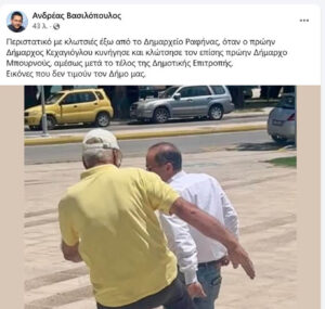 Irafina-ს მიერ გავრცელებული ინფორმაციის თანახმად მომხდარზე მუნიციპალიტეტის მრჩეველმა, ანდრეას ვასილოპულოსმა ისაყბრა: “რაფინას მერიის შენობის წინ ყოფილი მერი მის კოლეგას აედევნა და წიხლი ამოარტყა. აღნიშნული შემთხვევა მუნიციპალური კრების შემდეგ მოხდა. იხილეთ ფოტოსურათები, რომლებიც შეურაცხყოფას აყენებენ ჩვენს მუნიციპალიტეტს.”