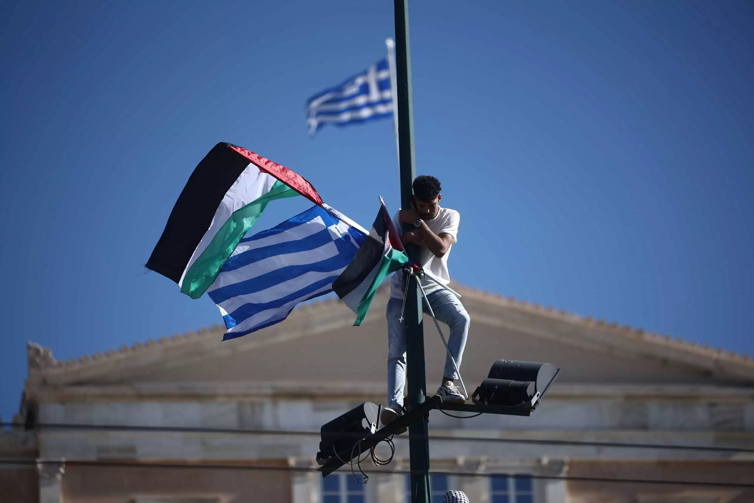 საბერძნეთის პოლიციამ დააკავა 22 წლის მამაკაცი, რომელმაც 5 ნოემბერს, კვირას, სინდაგმის მოედანზე გამართული აქციის დროს თავისი ქვეყნის, პალესტინის დროშა აღმართა.