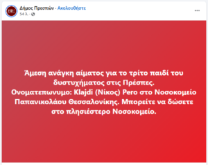 სალონიკში მდებარე პაპანიკოლაუს საავადმყოფო მიმართვას ავრცელებს მათთვის, ვისაც შეუძლია გახდეს სისხლის დონორი 17 წლის ბიჭისთვის, რომელიც პრესპესში მომხდარი ტრაგიკული ავტოსაგზაო შემთხვევის შედეგად მძიმედ დაშავდა.