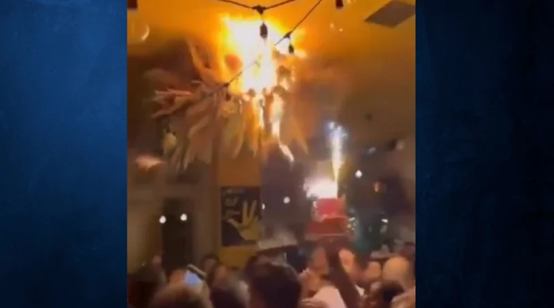 სოც. მედიაში გავრცელებულ ვიდეოში ჩანს, რომ ცეცხლი ტორტიდან საშობაო დეკორაციას მოეკიდა, ხოლო ცეცხლმოკიდებული ბურთი ბარში მყოფ ახალგაზრდებს თავზე დაეცა. მალევე ხანძარი საშობაო ნათურებსაც მოედო, რამაც აფეთქება და ცეცხლის დიდ ტერიტორიაზე მოდება გამოიწვია, რის შედეგადაც ბარის შუშაბანდი ჩამოიმსხვრა.