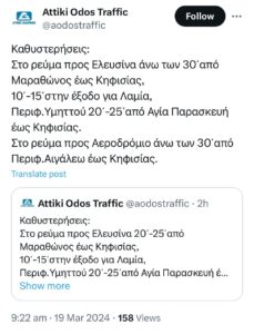 საცობები ათენის ქუჩებში. შეფერხებები კიფისოსა და ატიკი ოდოსზე.