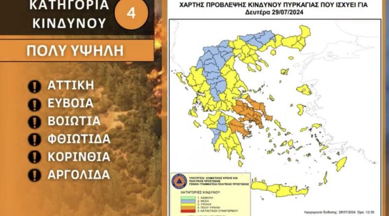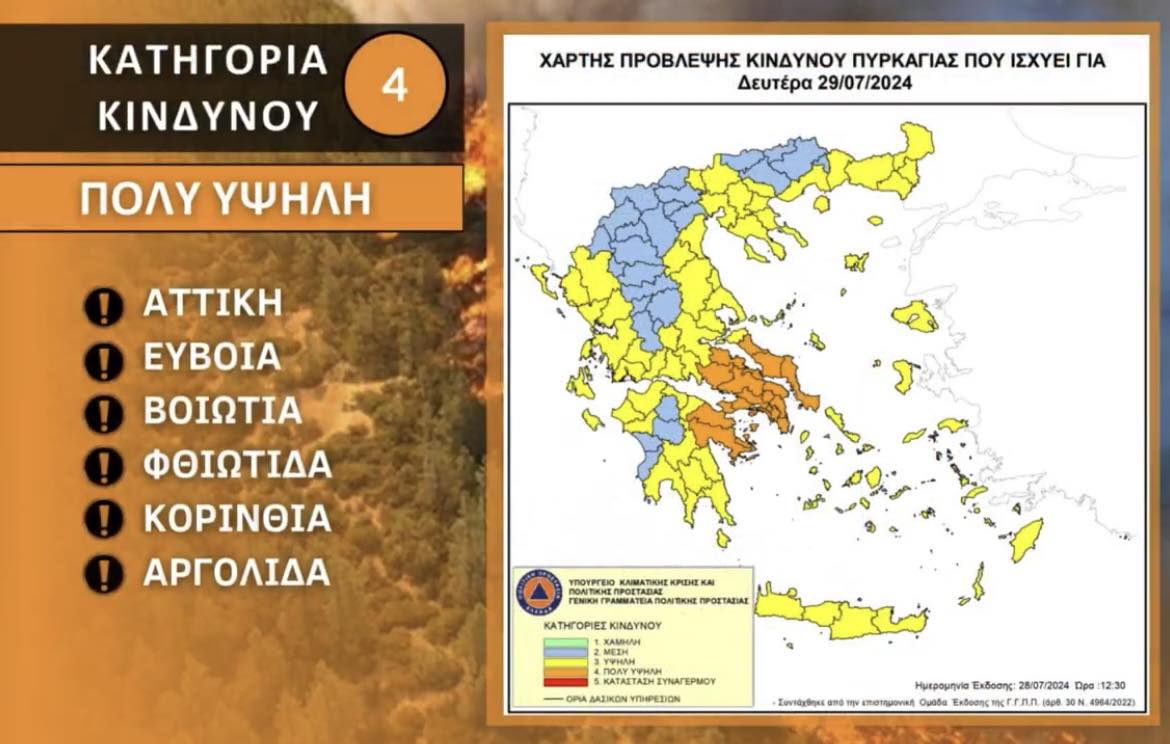 კლიმატის კრიზისისა და სამოქალაქო დაცვის სამინისტროს გენერალური სამდივნოს მიერ გამოქვეყნებული რუქის მიხედვით (civilprotection.gov.gr), დღეს, ორშაბათს, 29 ივლისს, ხანძრის გაჩენის ძალიან მაღალი რისკია შემდეგ რეგიონებში: