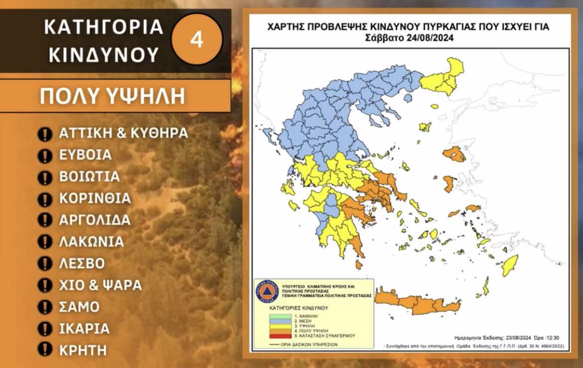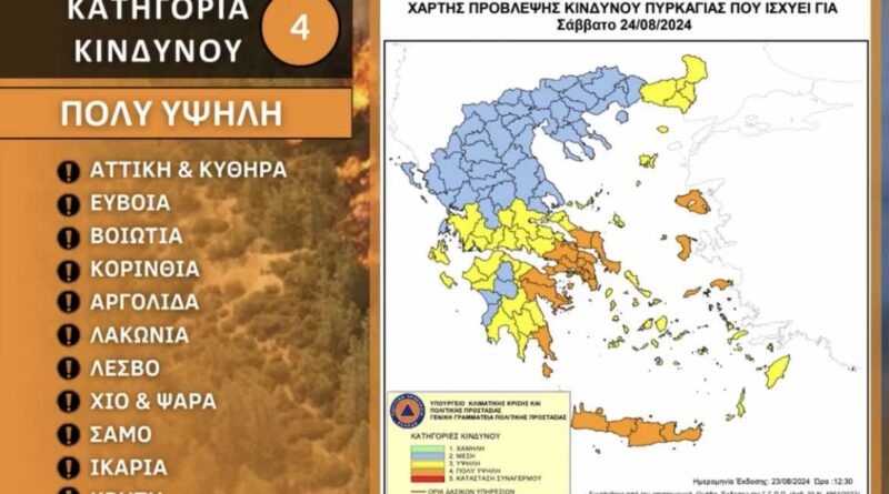 საბერძნეთის სამოქალაქო დაცვის სამინისტროს სამდივნოს მიერ გაკეთებული განცხადების თანახმად მერყევი ამინდი, ძლიერი ქარები და ტემპერატურა, რომელიც 39 გრადუსს მიაღწევს ხანძრის გაჩენის მაღალ რისკს გამოიწვევს საბერძნეთის 5 რეგიონში: